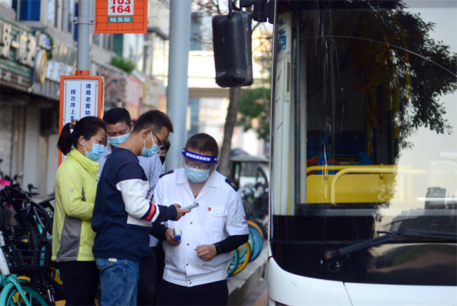 在長客西站264路、103路始發(fā)站,副隊(duì)長程玉磊配合公交駕駛員對乘客的健康碼、72小時(shí)核酸陰性證明、規(guī)范佩戴口罩、測量體溫等工作進(jìn)行檢查,廣大乘客主動(dòng)配合。