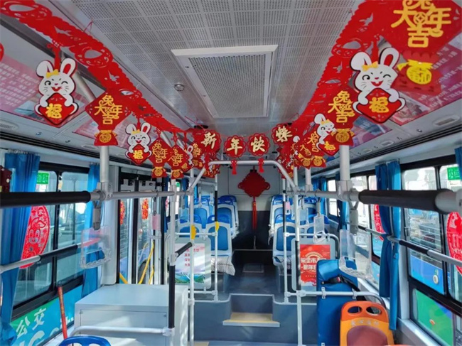 在209路車隊(duì),車廂、站務(wù)室、辦公區(qū)域處處洋溢著喜慶的中國風(fēng),生肖窗花張貼在車窗兩側(cè),可愛的卡通兔“微笑”著向乘客們送著“祝?!?,“新年快樂”的拉花昭示著中華民族的傳統(tǒng)佳節(jié)即將到來。