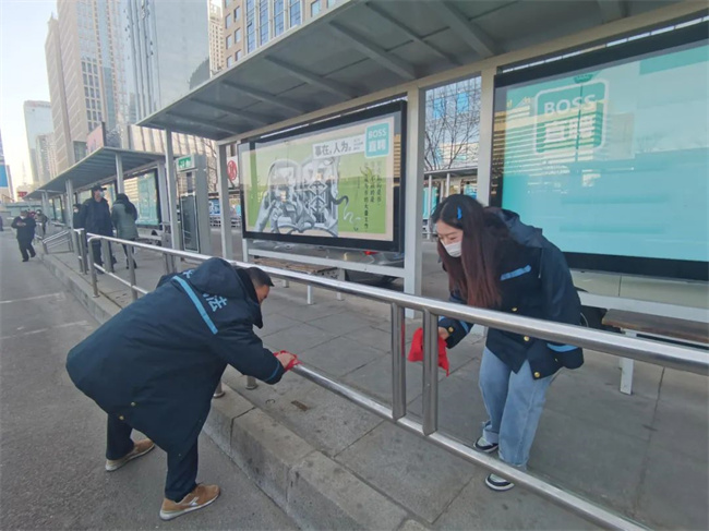 活動(dòng)中,志愿者們?yōu)閬硗每椭敢较颍蜕蠠犸?,并拿起掃把、鐵鍬等工具對(duì)垃圾、落葉等進(jìn)行清掃、分裝、清運(yùn),對(duì)公交護(hù)欄、電子站牌等衛(wèi)生死角進(jìn)行全面清理,使樞紐站內(nèi)環(huán)境衛(wèi)生煥然一新。