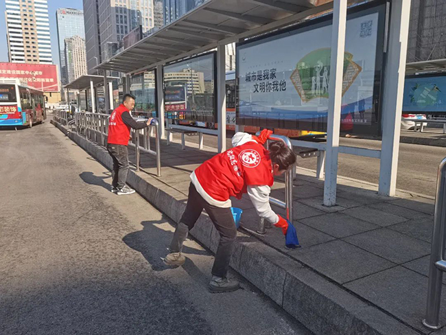 場站公司開展“清潔公交站臺,擦亮文明城市窗口”志愿服務(wù)活動。志愿者們帶著抹布、水桶、掃帚等清潔工具,在北站公交樞紐站對電子站牌、排隊護欄、座椅等進行清潔整理,改善了乘客的候車環(huán)境。