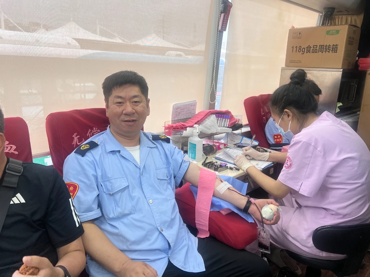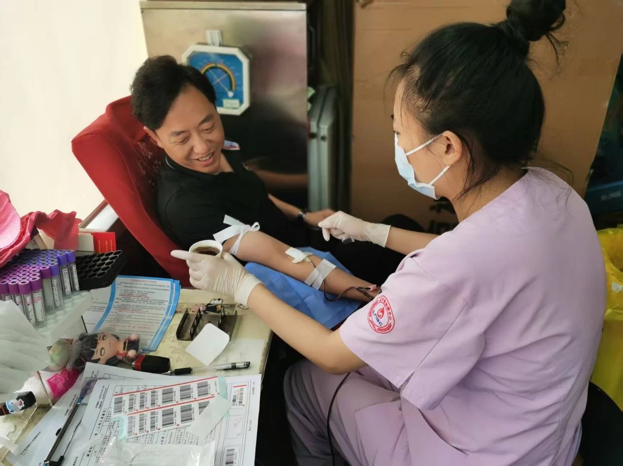 活動(dòng)現(xiàn)場(chǎng)溫馨有序。工作人員早早到位,引導(dǎo)志愿者們依次完成信息登記、健康檢查、血液初篩等環(huán)節(jié)。采血車(chē)直接駛?cè)敫鞔髨?chǎng)區(qū),方便職工參與。志愿者們紛紛挽起袖子,勇敢地伸出臂膀。隨著采血針的輕輕刺入,一袋袋承載著深情厚誼的熱血緩緩流入儲(chǔ)血袋中。