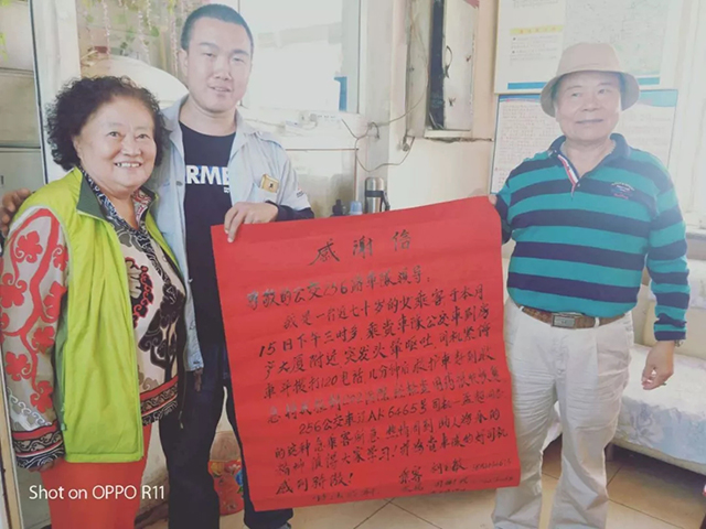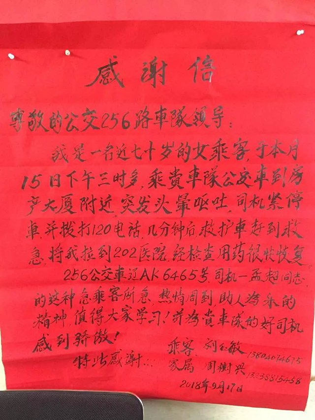 兩天后,老人攜同老伴,將一封寫滿真情的感謝信送到了通利公司256車隊。老人說:“當天舊疾復(fù)發(fā),非常危急,萬幸救護及時才沒有釀成悲劇。”據(jù)悉,在經(jīng)過短暫治療后,老人不顧阻攔,堅持要親自來到公交車隊對孟超同志表達感謝,并請求車隊領(lǐng)導(dǎo)對孟超這種救死扶傷的高尚品德提出鼓勵與表揚。老人在站務(wù)室等待了近兩個小時,才將這份真誠的謝意親自交到了駕駛員孟超的手上。